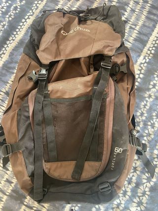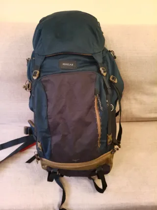 Mochila Forclaz de trekking en muy buen estado 70L. Incluye cubre mochila impermeable. La parte superior es desmontable, se puede quitar y poner según necesidad. Amplia, cómoda y resistente, ideal para senderismo, montaña o viajes de varios días. Cuenta con varios compartimentos, cremalleras robustas y correas ajustables.