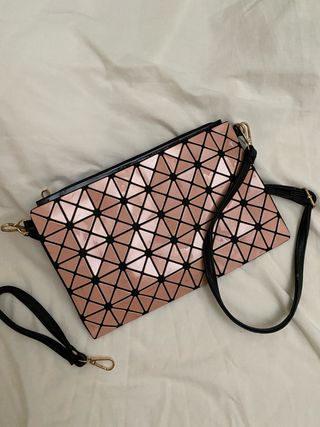 Elegante bolso con un diseño geométrico único. - Acabado brillante en tonos rosa nude - Cierre de cremallera. - Incluye correa de mano y correa para el hombro. - interior con dos bolsillos medidas : 27x 19 cms