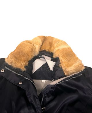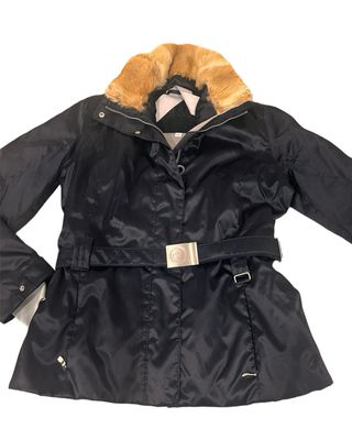 Chaqueta de esquiar para mujer. Negro satinado. Cuello de piel natural, extraible. Puño ajustable con agujero para dedo. Fajín interior para mayor ajuste. Tirantes interiores para colgar como mochila. Cinturón ajustable con logo en hebilla. Impermeable y térmica. Talla 38-40. Se ha usado en dos ocasiones