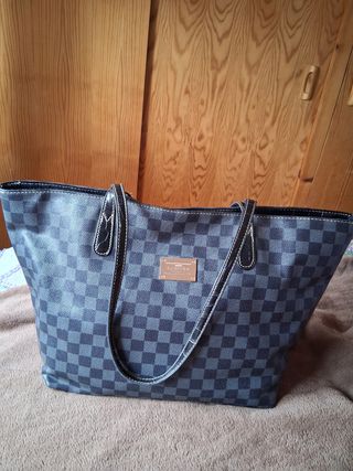 Bolso tote de mujer con diseño de cuadritos en negro y gris. Forrado y con varios bolsillos interiores. En buen estado con algún desperfecto como se aprecia en las fotos.