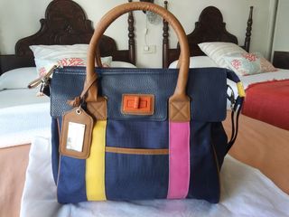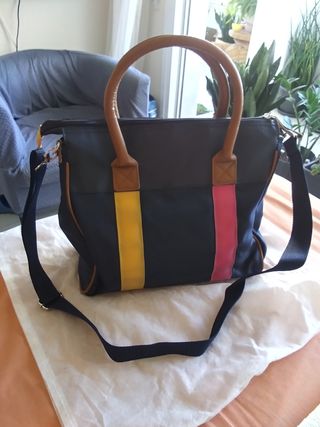 Bolso bandolera en azul marino con 2 listas de colores y asas marrones. Medidas 33x30 cm.