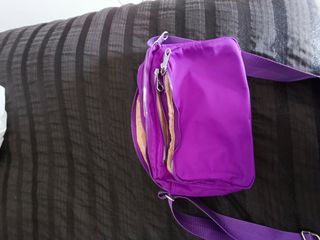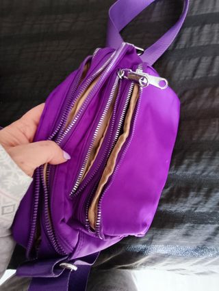 es una bandolera lo bueno de este bolso es que tiene muchos compartimentos y el color no se aprecia bien es más como se ve la banda de colgar es un morado aquí tira un morado a Rosa y no es así