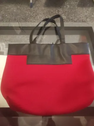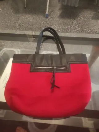 Bolso de mano con un diseño moderno y llamativo. - Combinación de colores rojo y marrón. - Asa de cuero sintético. - Bolsillo frontal con cremallera.