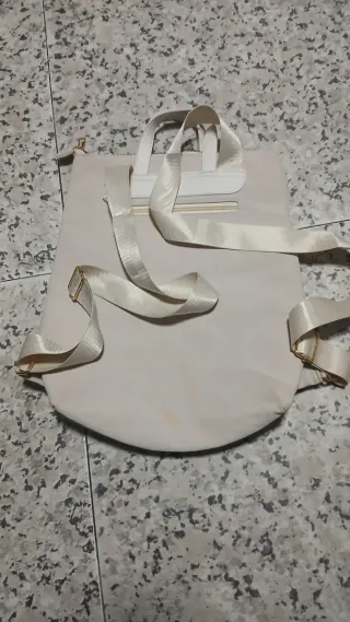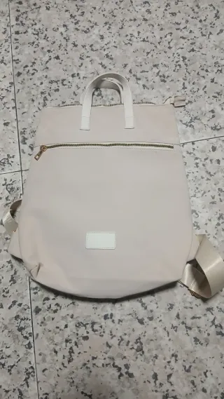 Mochila versátil que puede usarse como bolso. - Diseño moderno. - Cierre de cremallera. - Asa superior. - Correas ajustables. Tiene unas manchas en la parte de atrás, es bastante grande para meter cosas