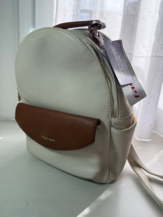 Mochila de mujer con un diseño moderno y práctico. - Material exterior de polipiel. - Combinación de colores blanco y marrón. - Detalle de solapa frontal con el logo de la marca. medidas 28 cm de alto x 23 cm de ancho nueva con etiquetas