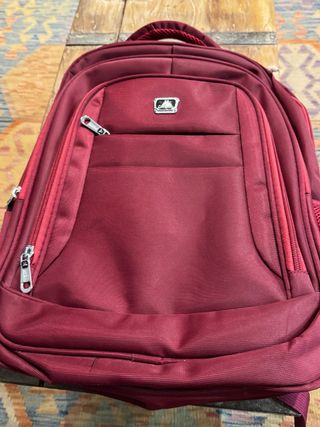 Mochila de color granate con varios compartimentos. - Compartimento principal con cremallera. - Bolsillo frontal con cremallera. - Dos bolsillos laterales de malla. - Asa superior acolchada. - Correas de hombro ajustables.