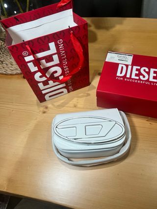 Bolso de mano Diesel en color blanco. Presenta un diseño moderno con el logo de la marca en relieve. - Logo grande de Diesel en la parte frontal. - Asa corta. - Cierre de solapa.