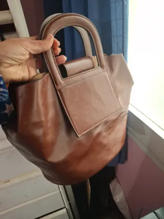 Bolso de mano con un diseño elegante y moderno. - Material: Piel sintética. - Color: Marrón. - Asa superior. - Bolsillo frontal.