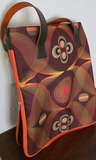 Bolso de mujer con un diseño llamativo y moderno. - Estampado geométrico en tonos marrones y naranjas. - Asas de color naranja. - Cierre de cremallera.