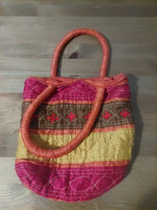 Bolso de mano con un diseño colorido y vibrante. - Tejido con detalles bordados. - Asas reforzadas para mayor comodidad. - Diseño de rayas en tonos cálidos.