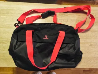 Bolso deportivo Topper con un diseño moderno y práctico. - Color principal negro con detalles en rojo. - Asas de mano cómodas. - Bolsillo frontal con cremallera. El cierre principal está roto y tiene signos de uso