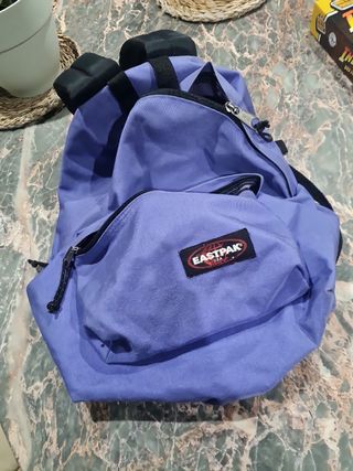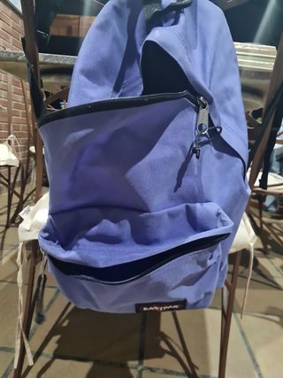 Mochila Eastpak en color lila. Está en buen estado, aunque tiene algunas señales de uso. - Tiene un compartimento principal con cremallera. - Dispone de un bolsillo frontal también con cremallera. - Las correas son ajustables.