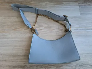 Bolso de mano o al hombro en tono celeste. Diseño moderno y versátil. - Correa ajustable. - Cadena dorada decorativa. - Cierre de cremallera.