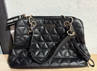Bolso de mano Guess con un diseño acolchado y elegante. - Acabado en negro. - Detalle de cadena en las asas. - Correa de hombro ajustable. - Logo metálico de la marca en la parte frontal.