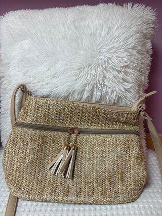 Bolso de paja tejido con un diseño moderno y práctico. - Material: Paja - Cierre de cremallera - Adorno de flecos