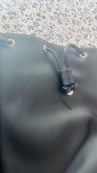 Bolso de mujer con un diseño moderno y elegante. - Material principal: piel sintética. - Detalle de solapa en ante. - Asa ajustable para llevar al hombro o cruzado. - Cierre con imán y cordón. - Herrajes metálicos dorados.