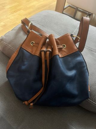 Bolso de mujer con un diseño moderno y práctico. - Combinación de tela azul y detalles en piel marrón. - Cierre de cordón ajustable. - Asas cómodas para llevar al hombro.