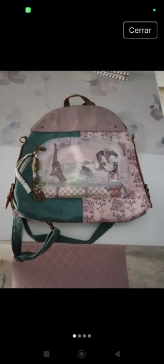Mochila con un diseño único y llamativo, combinando diferentes estampados. - Estampado frontal con Torre Eiffel y figuras. - Detalle de borla colgante. - Cierre superior con solapa. - Correas ajustables.