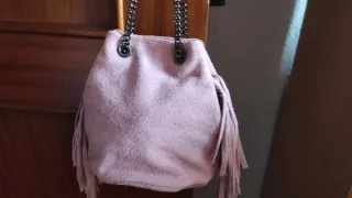Bolso de mano con un diseño moderno y juvenil. - Material tipo ante. - Adornado con flecos. - Cadena metálica para llevar al hombro.