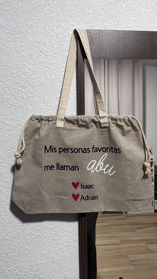 Bolso de tela con un diseño personalizable. - Frase Mis personas favoritas me llaman abu. - Nombres Isaac y Adrián con corazones. - Cierre de cordón ajustable.