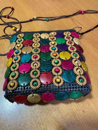 Bolso de mano con un diseño único y llamativo, perfecto para añadir un toque de color a tu estilo. Nuevo nunca se ha usado - Decorado con círculos de colores y detalles florales. - Cierre seguro para tus pertenencias. - Correa ajustable para llevarlo cómodamente.