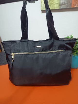 Bolso de mano y hombro de la marca Lacoste. - Color verde oscuro con detalles en verde más claro. - Asas de mano y correa de hombro. Sin utilizar las correas. - Logo de la marca en la parte frontal. Interiormente lleva una cremallera pequeña. Bastante amplio. Utilizada en contadas ocasiones, está prácticamente nuevo.