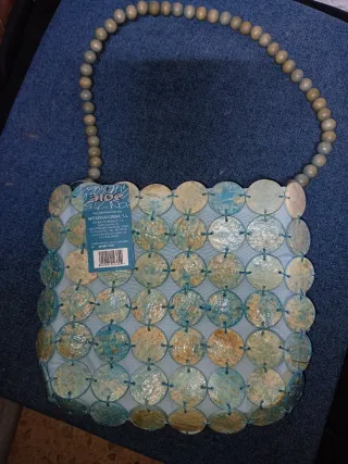 Bolso de mano con un diseño único y artesanal. - Elaborado con fibras naturales. - Detalles en tonos beige y azul. - Asa de cuentas de madera.