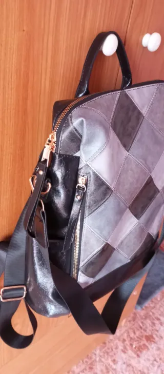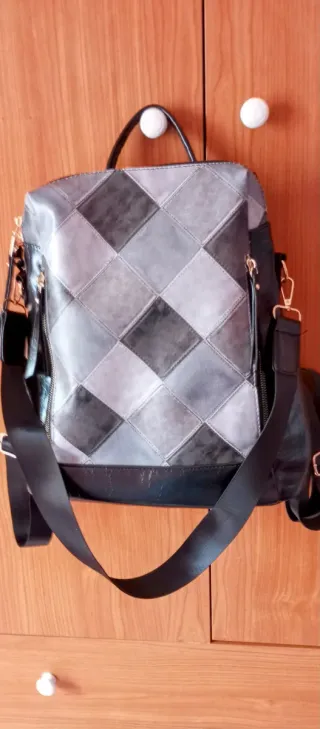 Preciosa mochila de mujer, nueva a estrenar. De estilo moderno y elegante. Diseño con estampado geométrico de rombos en tonos grises y negros. Asa superior y correas ajustables para llevarla cómodamente al hombro o como mochila. Cremalleras funcionales.