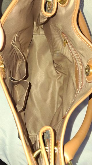 Bolso de hombro con un diseño elegante y práctico. - Color beige con detalles en marrón. - Material con textura. - Asas cómodas para llevar en la mano o en el antebrazo.