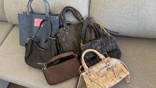 Conjunto de seis bolsos de diferentes estilos y materiales: • Bolso negro de hombro Valentino • Bolso pequeño marrón con cadena plateada Mango • Bolso azul con cadena dorada Mango • Bolso beige Bershka • Bolso marrón Bershka • Bolso grande azul Kurt Geiger