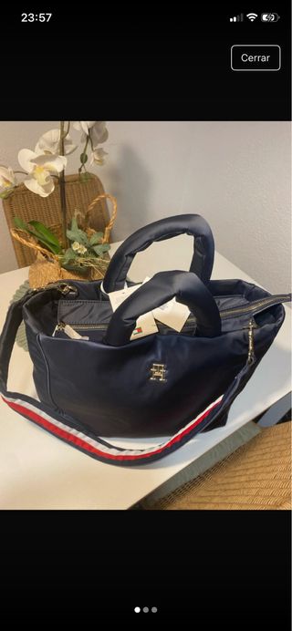 Bolso de mano y hombro de la marca Tommy Hilfiger. - Diseño moderno y elegante. - Combinación de colores azul y detalles multicolor. - Asas cómodas para llevar en la mano. - Correa ajustable para el hombro.