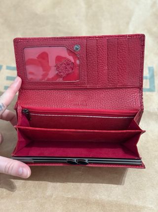 Elegante cartera de mujer con un diseño moderno. - Compartimentos interiores para tarjetas. - Bolsillo con cremallera. - Cierre de botón a presión. - Como se ve en las fotos esta en un lateral cuarteada pero esta sin estrenar Escucho ofertas