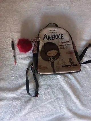 Mochila cartera de la marca Anekke con un diseño único. - Estampado con la Torre Eiffel y una figura. - Detalle de pompón rojo. - Cierre de cremallera. - Correa ajustable. - Bolígrafo de la marca Anekke