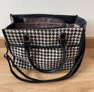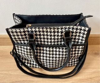 Elegante bolso de mano para mujer, ideal para el día a día. Es de tamaño mediano y tiene un diseño clásico en blanco y negro de cuadros. - Asa de mano y asa larga para llevarlo al hombro o cruzado. - Cierre de cremallera principal. - Bolsillo interior con cremallera y compartimentos.