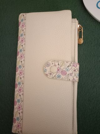 Precioso monedero para mujer, ideal para llevar lo esencial. Es de color beige con un diseño floral multicolor en los laterales. - Diseño elegante y femenino. - Compartimento con cremallera. - Acabado de alta calidad.