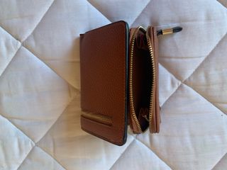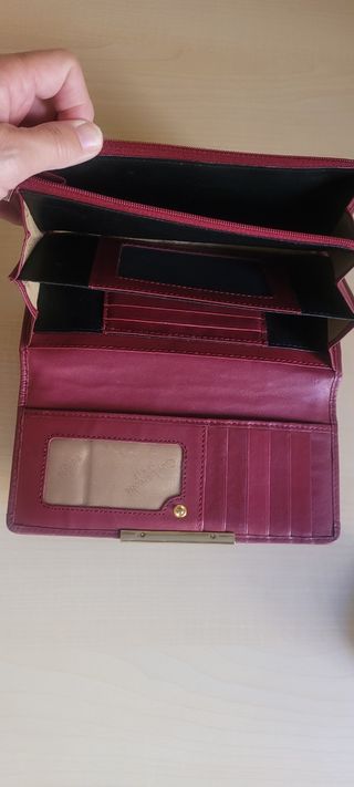 Elegante billetera de piel para mujer. - Compartimento para tarjetas. - Ventana para identificación. - Cierre de cremallera. Mide 11x 20 cm Está en perfecto estado