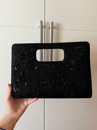 Elegante bolso de mano con un diseño adornado con pedrería y lentejuelas. - Cierre de solapa. - Asa incorporada para llevarlo cómodamente. - Diseño floral bordado.