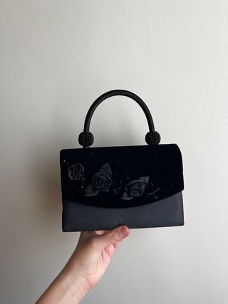 Elegante bolso de mano con un diseño sofisticado. - Adornado con delicadas rosas de tela. - Asa con detalles de cuentas. - Acabado en terciopelo y satén.