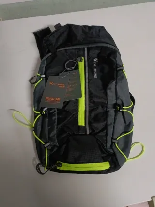 Mochila de senderismo West Biking. - Diseño en color negro con detalles en verde lima. - Cremalleras y cordones de ajuste en contraste. - Etiqueta de marca visible.