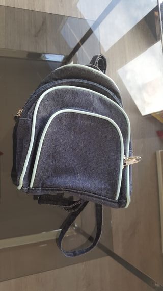 Mochila pequeña de tela vaquera con bolsillo interior y bolsillo delantero. La parte interior está forrada en tela negra. Las partes metálicas no están totalmente brillantes pero se conservan bien (ver fotos).