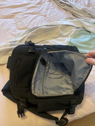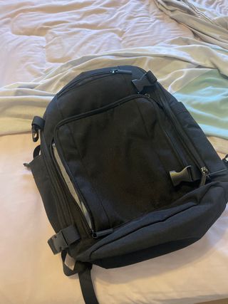 Mochila negra, ideal para viajes en avión. Cuenta con varios compartimentos para organizar tus pertenencias. - Compartimento principal espacioso. - Bolsillos frontales con cremallera. - Correas ajustables para mayor comodidad.
