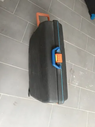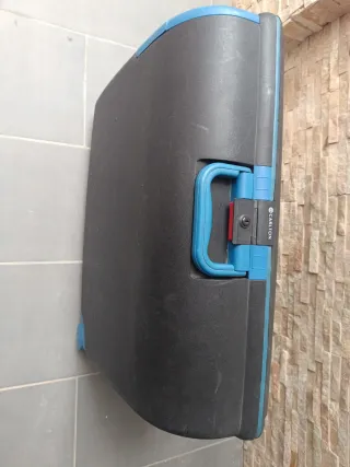 Maleta de la marca Carlton con un diseño moderno y funcional. Cierre con llave - Color principal negro con detalles en azul. - Asa de transporte integrada. - Cierre de seguridad.
