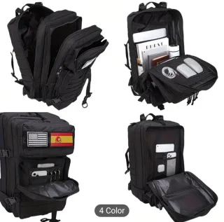 Mochila de estilo táctico en color negro de 45L de capacidad. Diseñada para ser resistente y funcional. - Compartimentos múltiples para organización. - Correas ajustables para mayor comodidad. - Parches de bandera de EE. UU. y España incluidos.