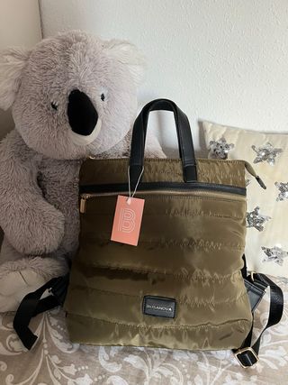 Mochila acolchada de la marca Bosanova. - Diseño moderno y funcional. - Combinación de colores verde oliva y negro. - Asa superior y correas ajustables. -TIENE UN DIENTE DE LA CREMALLERA ROTO, pero no influye a la hora de abrir la cremallera