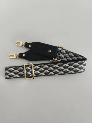 Correa de repuesto para bolso de la marca Lonbali. Nueva a estrenar sin usar - Diseño geométrico en blanco, negro y gris. - Herrajes dorados. - Cierre de mosquetón en ambos extremos.