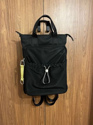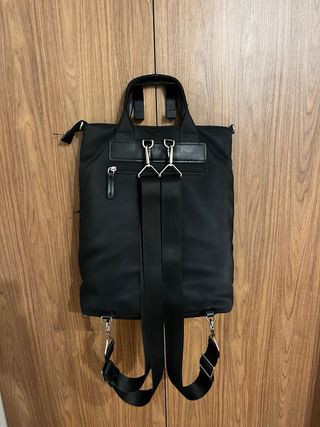 Mochila / Bolso de la marca Parfois en color negro con compartimento para portátil, ideal para trabajo o universidad. Características: • Diseño 2 en 1: se puede usar como mochila o como bolso con asa superior. • Material resistente y fácil de limpiar. • Cremalleras metálicas en perfecto funcionamiento. • Bolsillo frontal amplio con cierre y compartimento elástico + cremallera. • Bolsillo trasero con cremallera. • Interior espacioso con compartimentos organizadores. • Correas ajustables y desmontables con varias posiciones.
