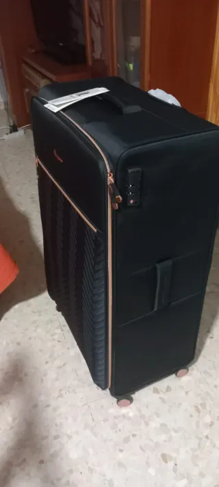 Maleta de viaje grande, nueva y sin estrenar. Cuenta con un diseño moderno y elegante. - Color negro. - Cremalleras y detalles en tono cobre. - Panel frontal con diseño texturizado. - Ruedas para facilitar el transporte.