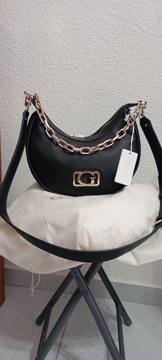 Bolso de la marca Guess en color negro, completamente nuevo. - Diseño moderno y elegante. - Cadena dorada decorativa. - Logo metálico frontal.