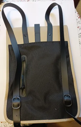 Mochila de la marca Rains en color beige con detalles en negro. Diseño moderno y funcional. - Material impermeable. - Cierre de solapa con correa. - Bolsillos exteriores.