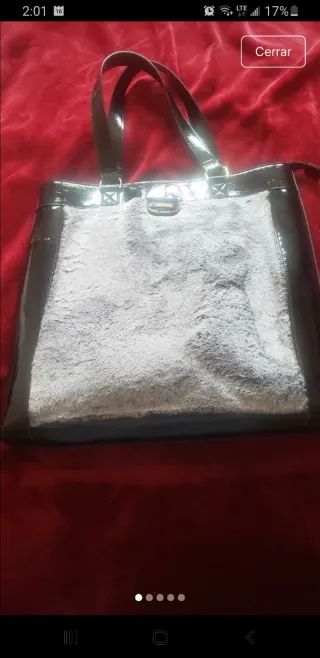 Bolso de hombro negro acharolado con parte frontal de peluchito gris. Gran capacidad y cierre de cremallera. Medidas: Largo 37cm Ancho 40cm